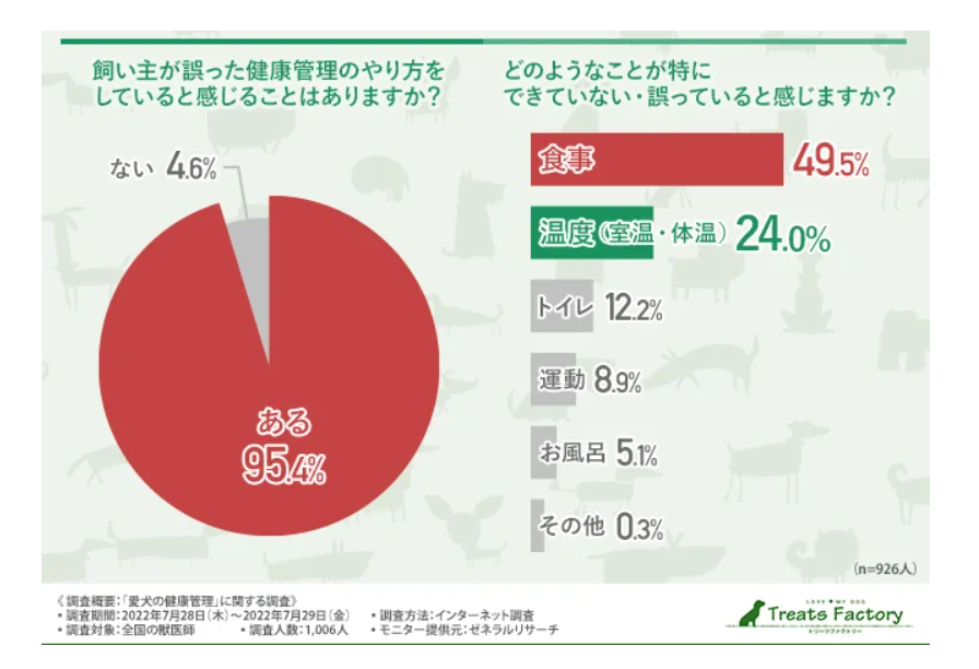 先ほどのアンケートでは愛犬の食事や運動、室内温度に気を配っている飼い主さんは多いという結果が出ていましたが、多くの獣医師さんは毎日の食事の与え方や室内の温度管理などが誤っていると感じているようです。