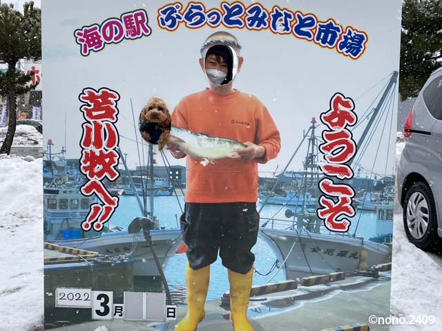 …ですが、海の幸を堪能する前に、フェリーの中で排泄できなかったボンくんにまずはスッキリしていただくため、降りしきる雪の中、いざ、出陣!とばかりに尻尾を振り振り飛び出して行くNONOとボンくん。
