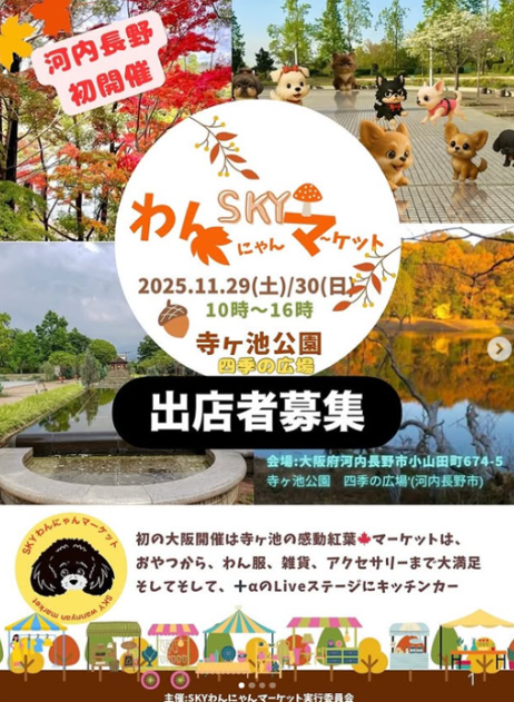 - ▶⑩2025年11月29日(土)~30日(日)開催!「SKYわんにゃんマーケット in 寺ヶ池公園」in 寺ヶ池公園【大阪府河内長野市】