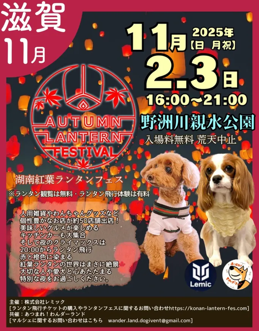 滋賀県湖南市の「野州川親水公園」で開催される夜空を彩る幻想的なランタンと、秋色に染まる紅葉のコラボレーションが楽しめる季節限定のイベントです。わんちゃんマルシェの他に、地元グルメやクラフト雑貨が並ぶマルシェ、キッチンカー、音楽ステージも登場。昼は愛犬とのお散歩や撮影を楽しみ、夕方からはライトアップされた約2,000基のランタンの灯りで特別な時間を過ごせます♪