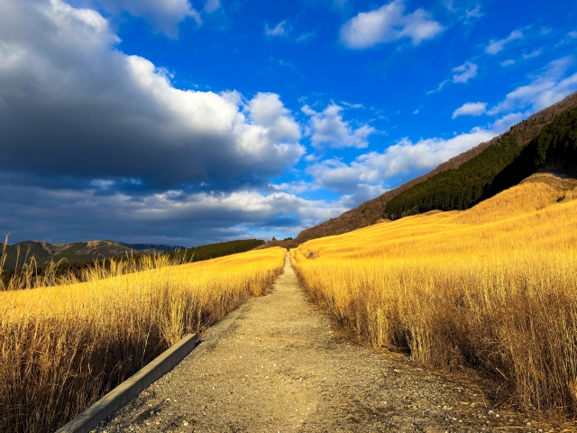 箱根の秋を代表する名所「仙石原すすき草原」は、一面に黄金色の穂が揺れる幻想的な風景が魅力。9月下旬から11月上旬にかけて見頃を迎え、夕陽に照らされたすすきが銀色に輝く光景は息をのむ美しさ。遊歩道は整備されており、愛犬と一緒に秋風を感じながら散策が楽しめます。