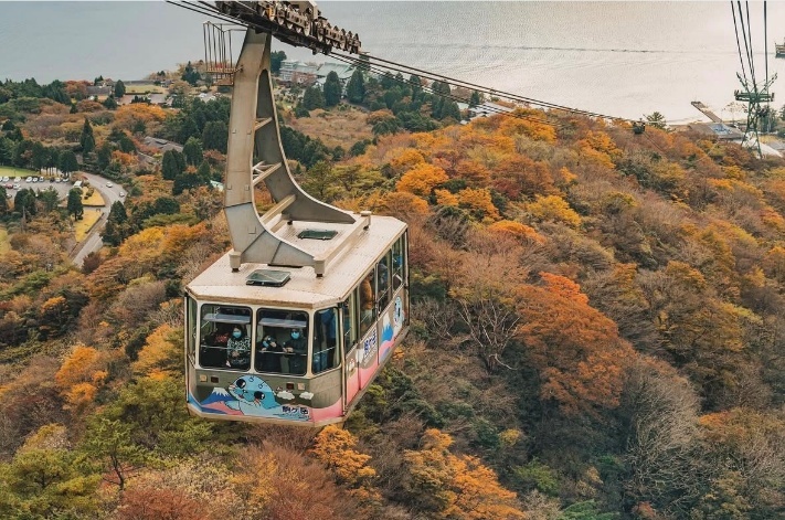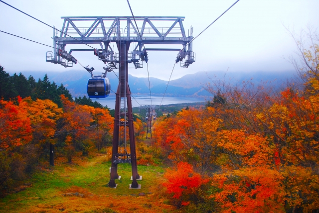 大涌谷や芦ノ湖を望む空中散歩が楽しめる「箱根ロープウェイ」。秋になると外輪山一帯が鮮やかな赤や黄金色に染まり、ロープウェイから見下ろす紅葉パノラマは圧巻です。特に早雲山〜大涌谷〜姥子〜桃源台までの区間は、標高ごとに色づきのグラデーションが変化し、まるで絵画のよう。