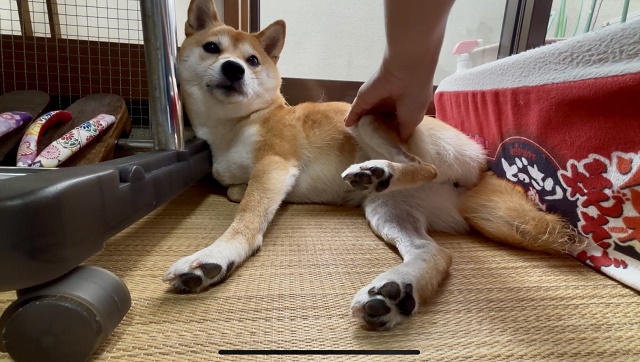 後ろ脚の付け根に位置する鼠径リンパ節は、内股のくぼみに指を入れるように沿わせて軽く揉みます。