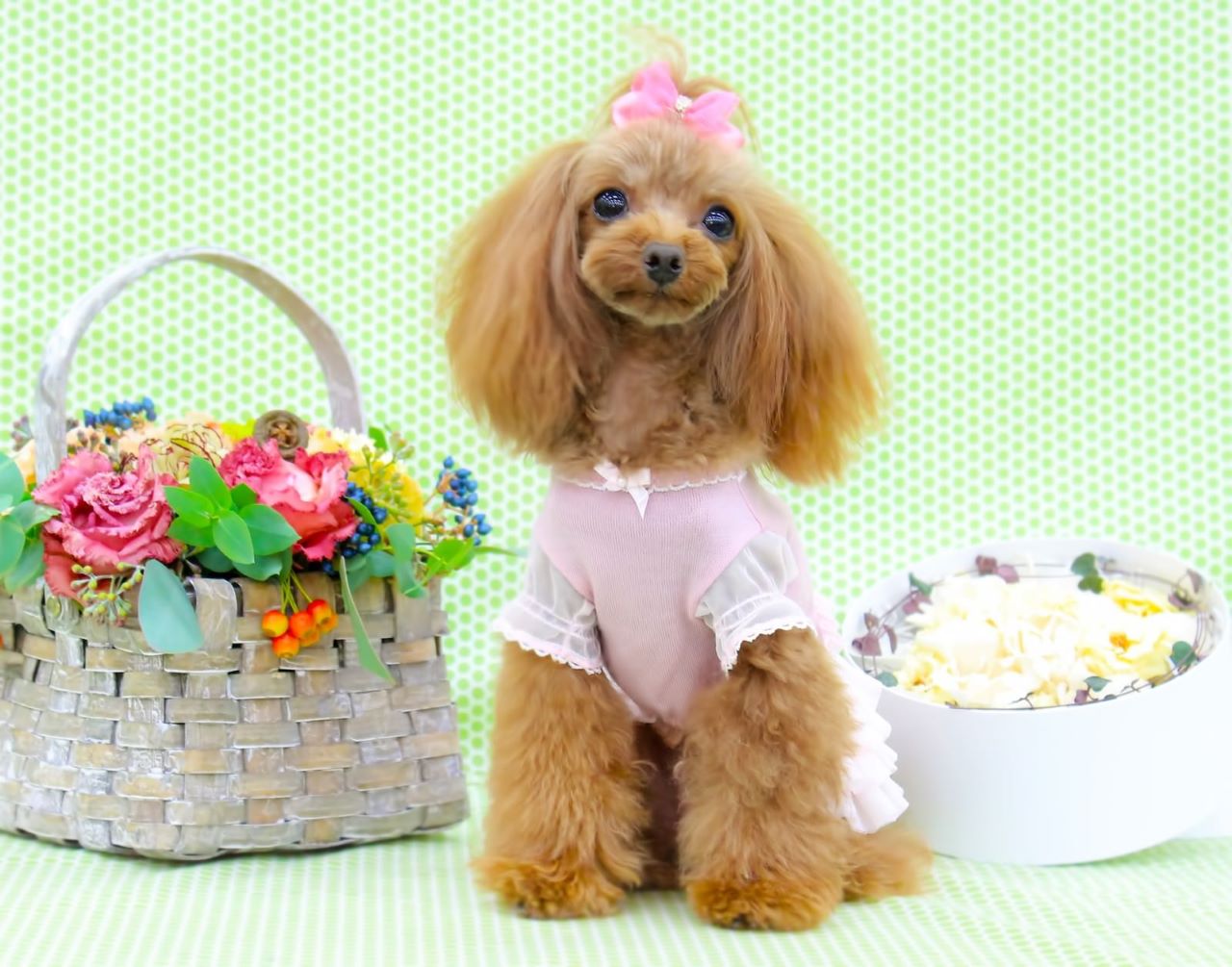 スプリング系等が似合う犬の場合、春を思わせるようなふんわりとした可愛らしいクリームイエローや桜のようなピンク、萌黄などの黄緑色などを取り入れると元気で華やかな印象が得られます。