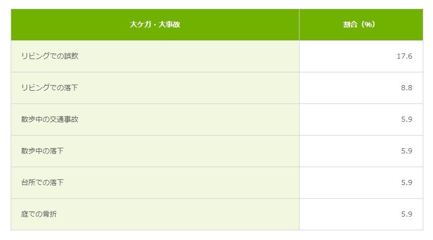 特に大怪我を招いた原因の多くに「落下」が入っていることを考えると、日常的に「落下事故」に対して注意しておかなければならないことがわかります。