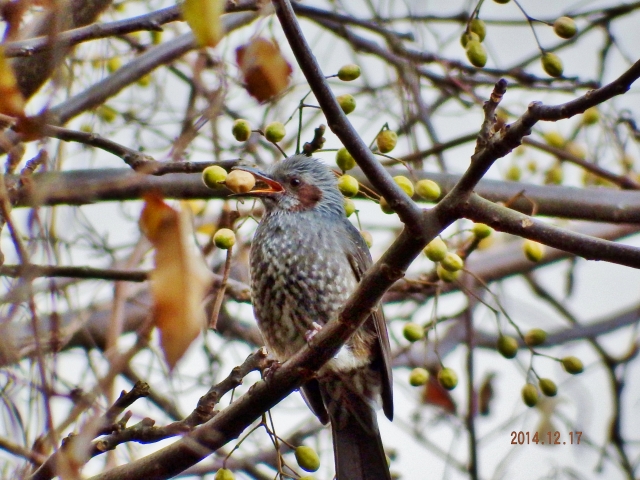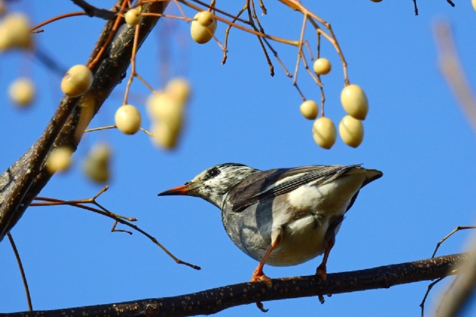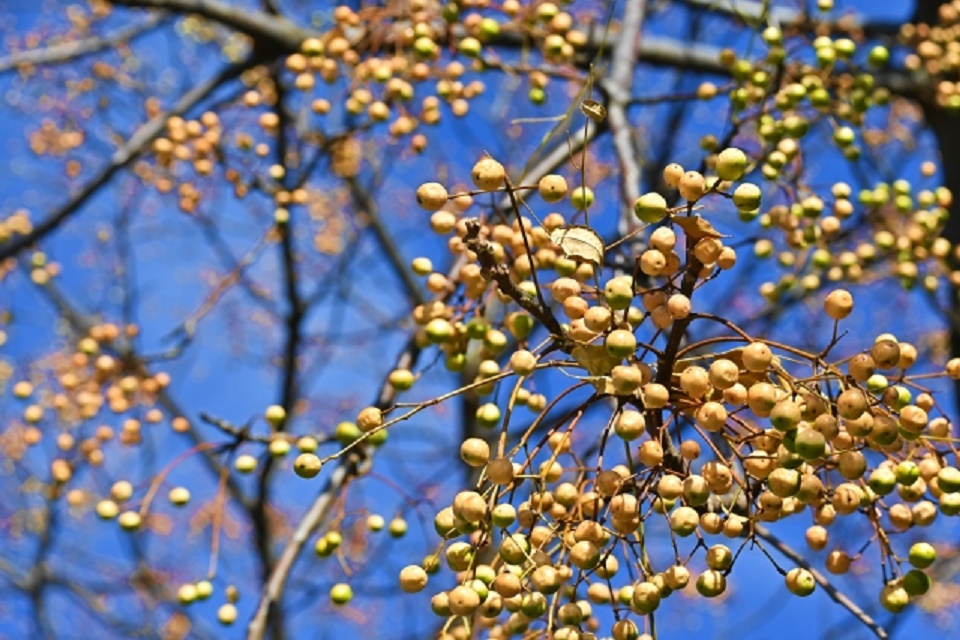 その後、冬頃に自然と地面に落下する時期になると、ほぼクリーム色となったセンダンの実を求めてヒヨドリなどが枝に止まったり、口にしたりする姿が見られるようになります。