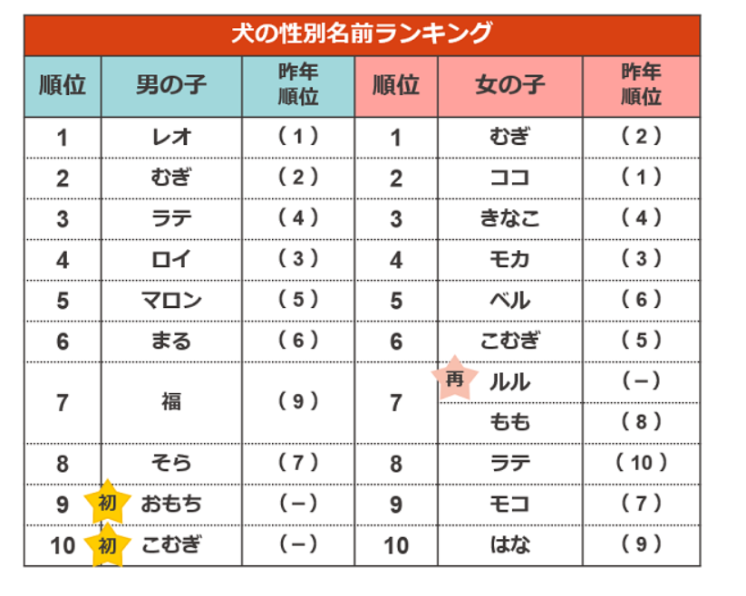 オス(男の子)で人気の名前は「レオ」「むぎ」「ラテ」で、昨年の名前ランキングでもトップ5にランクインしています。