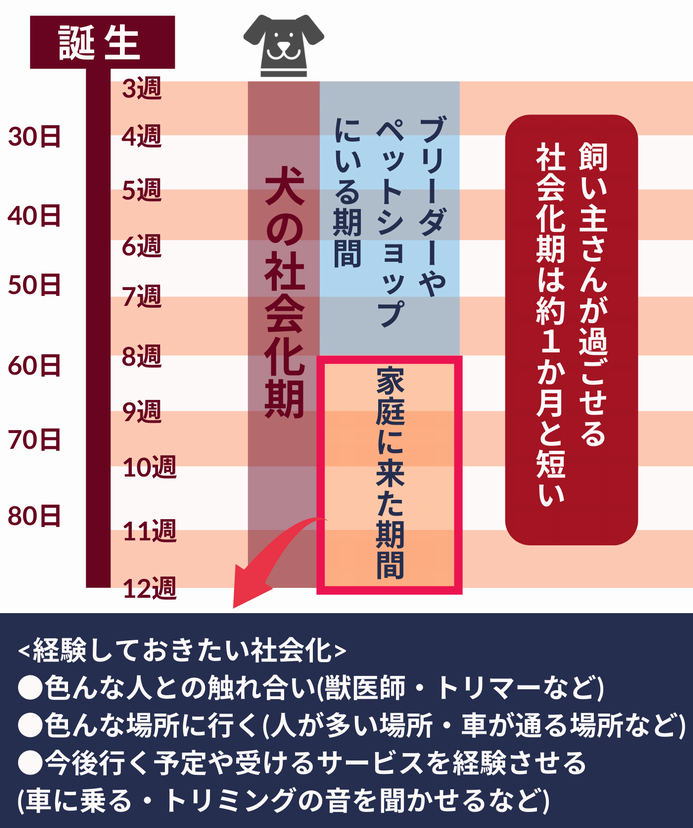 ペットショップやブリーダーなどでは、子犬が生まれてから8週齢を経過するまでは販売をしてはいけないと定められているため、飼い主さんが子犬と過ごせる社会化期は約1ヶ月と非常に短いです。