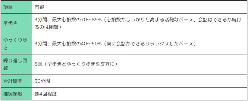 早歩きによって心拍数の上昇を図り、ゆっくり歩きによって心拍数の緩和を繰り返すことは、心血管機能の強化に効果的です。
