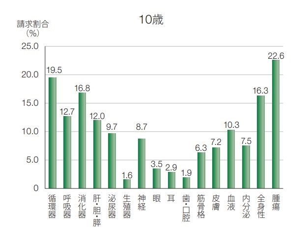 下の図は、ペット保険の「アニコム損害保険株式会社」が発表した10歳の犬の疾病情報の統計データのグラフです。