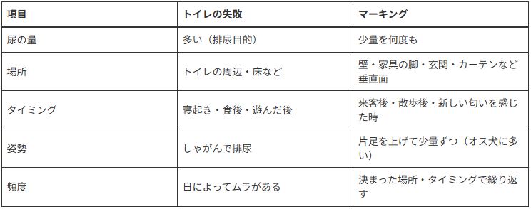 このため、もしも愛犬に排泄関連で困ったような行動が見られているような時には、以下の違いを参考に、見分けるように意識しながら判断しましょう。
