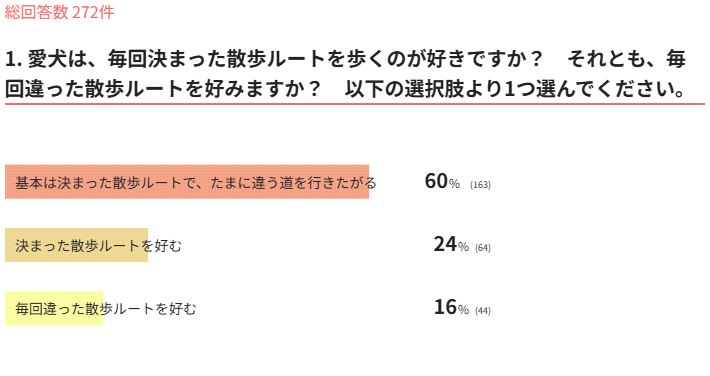 上記のアンケート結果では、総回答数272件中60%(163人)以上の飼い主さんで「基本は決まった散歩ルートで、たまに違う道を行きたがる」と回答しました。