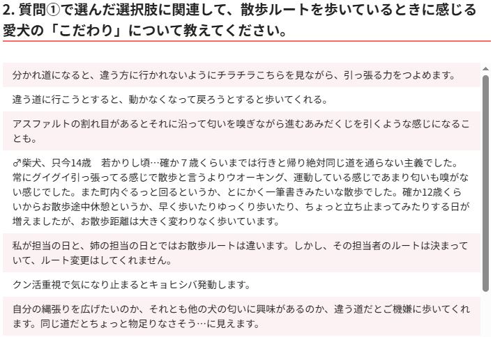 質問1に対するそれぞれの回答のため、「分かれ道だと引っ張る力を強める」といった回答や「違う道だとご機嫌そう」といった回答がある一方、質問1で「決まった散歩ルートを好む」と回答した24%(64人)の飼い主さんからは「違う道に行こうとすると動かなくなる」といった回答や「クン活重視で気になり止まると拒否柴発動」といった回答も見受けられました。