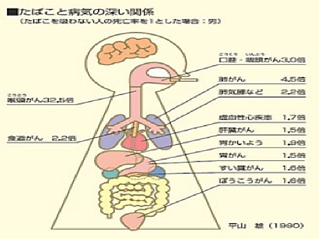 私たち人へ及ぼすタバコの悪影響だけでも口腔・咽頭ガン、肺ガン・肺気腫、喉頭ガン、食道ガン、虚血性心疾患など、様々な悪影響が1.6倍~32.5倍まで幅広く危惧されています。