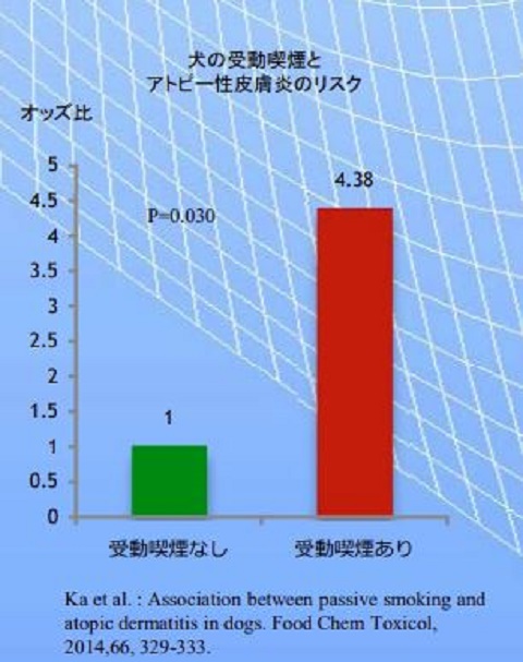 特に受動喫煙で意外なのは、アトピー性皮膚炎のリスク増だと思いますが、2014年に行われた愛煙家の飼い主さんを持つ愛犬161頭のアトピー性皮膚炎症状の調査の結果、高濃度の受動喫煙に曝露された犬のアトピー性皮膚炎のオッズ比は、4.38(95%信頼区間:1.10-17.44、p=0.03)だったとされました。