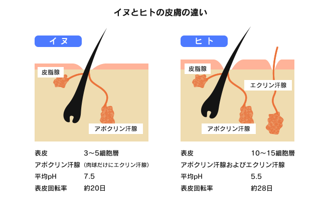 しかし犬の場合はその逆で、全身をアポクリン腺が分布し、肉球などの一部分にエクリン腺があるだけです。