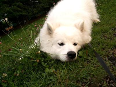 散歩中、ゴロゴロ始めました。涼しそうな場...