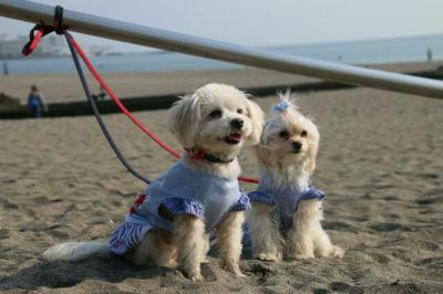 ポンコが飼い主に抱っこされて千里浜を散歩...