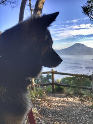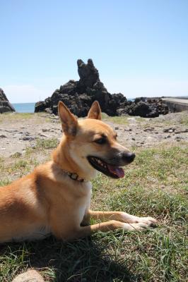 犬岩と愛犬の耳の角度が丁度いい感じに撮れ...