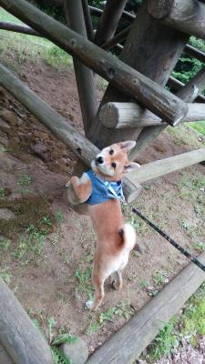お散歩中、丸太に前足をかけて休憩。名前を...