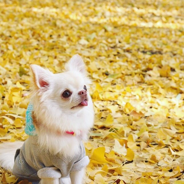 秋色に色づいた葉っぱの絨毯の上でパチリ♪