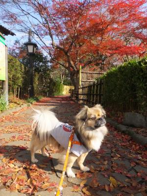 真っ赤な紅葉の絨毯の上でモデル気取りのへ...