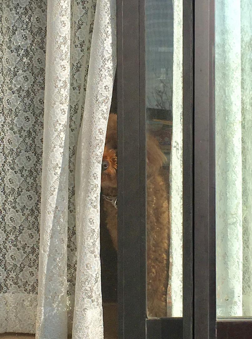 仕事に行く時 窓からのお見送りをしてくれますが 今日はカーテンの隙間からこっそりでした(笑)