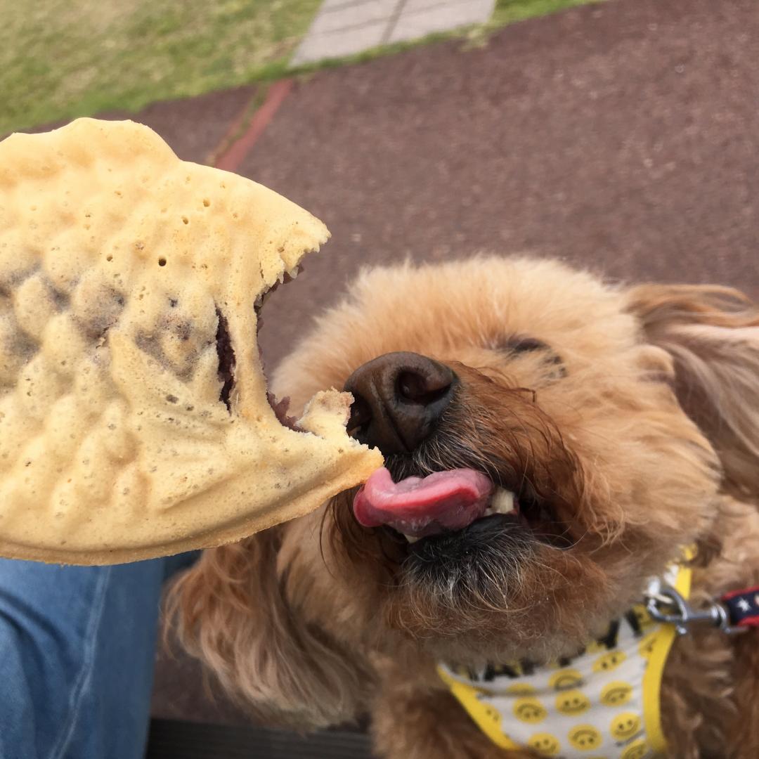 お父さんがかじったたい焼きに、届きそうで届かなーい!必死で舌を伸ばして、ボクにも、ちょーだいアピールしています