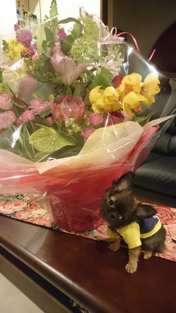 まだ4ヶ月目です。ママの誕生日プレゼントのお花と一緒に、得意の首かしげポーズ♪