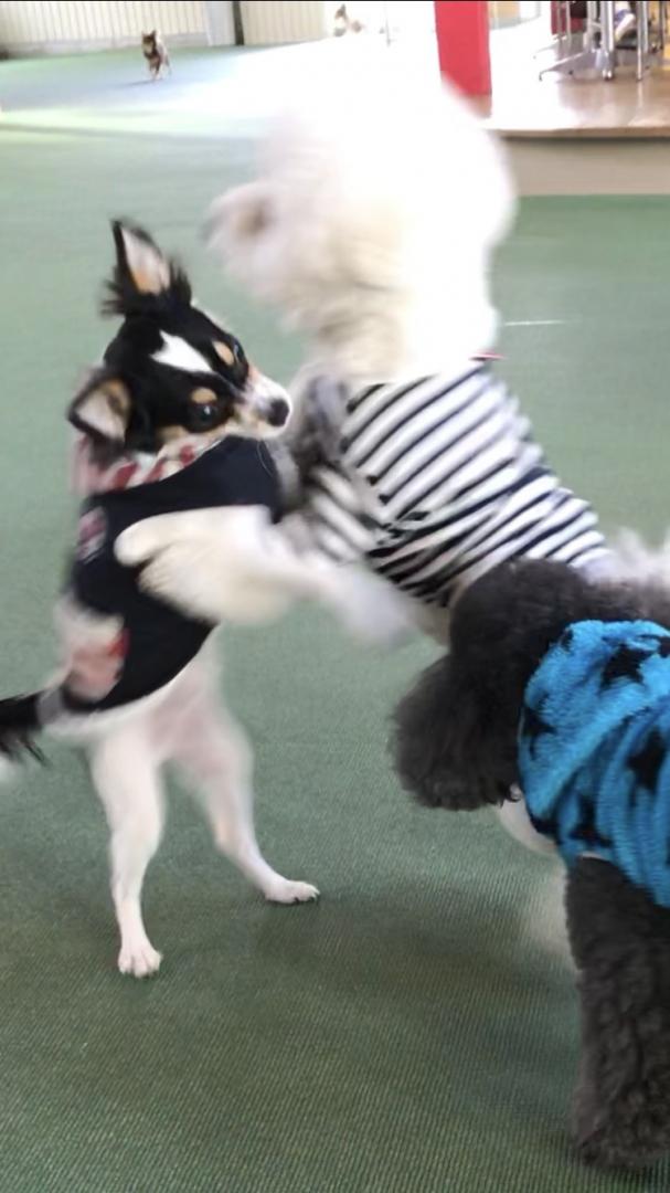 頭に、ハートのあるチワワですが、お友達と相撲取りをしてます。