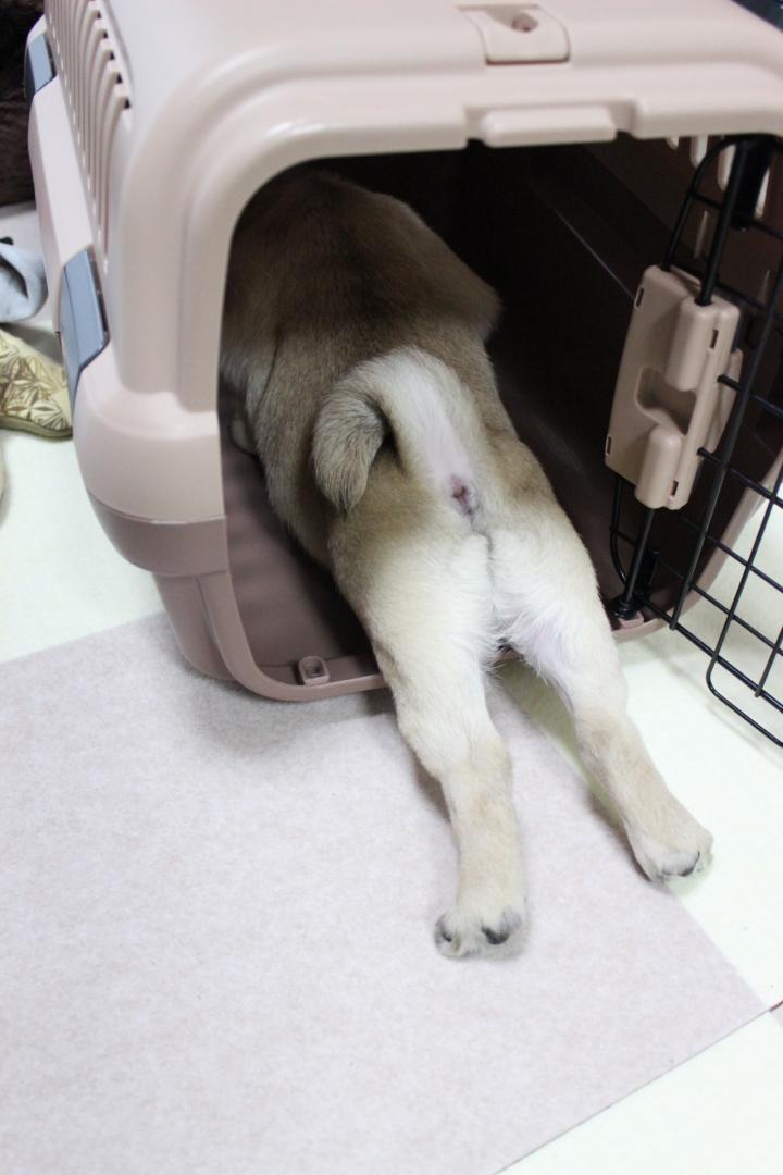 こわいけど、キャリーバックの中にはおやつがはいている! 脚をのばーして、がんばりました。