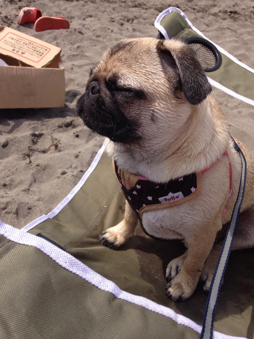 初めての海で、撮りました♡♡ イスに座って大人しく、していました。 日差しをみて眩しそうにしていました。
