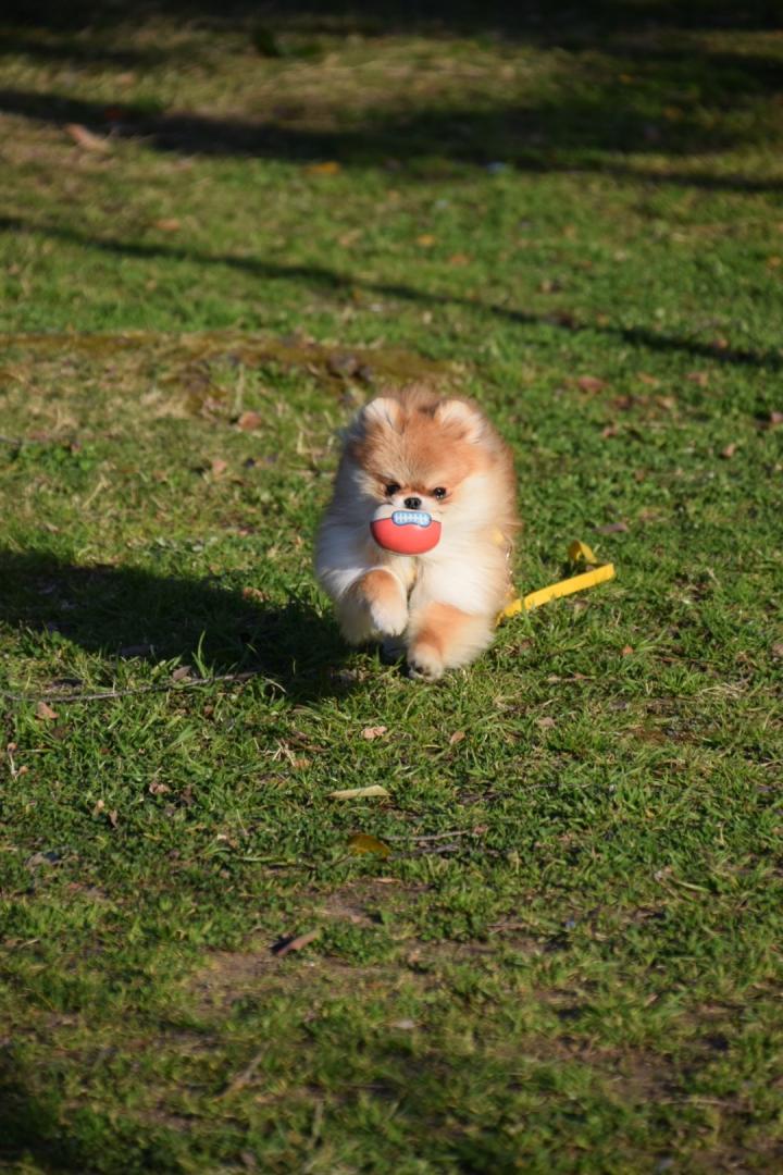投げたボールをくわえ、得意気にダッシュで帰ってきます♪