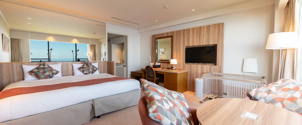 全100室のアートとモダンな内装が織りなす客室からは目の前に広がるオーシャンビューをお楽しみいただけ、ゆったりとした時間をお過ごしいただけます。愛犬と一緒にくつろげる「ペットルームキング」は2021年に改装したお部屋です。小型犬2匹までご一緒にご宿泊いただけます。お食事は夕朝食ともお部屋食なので、愛犬と一緒にゆったりとお楽しみいただけます。